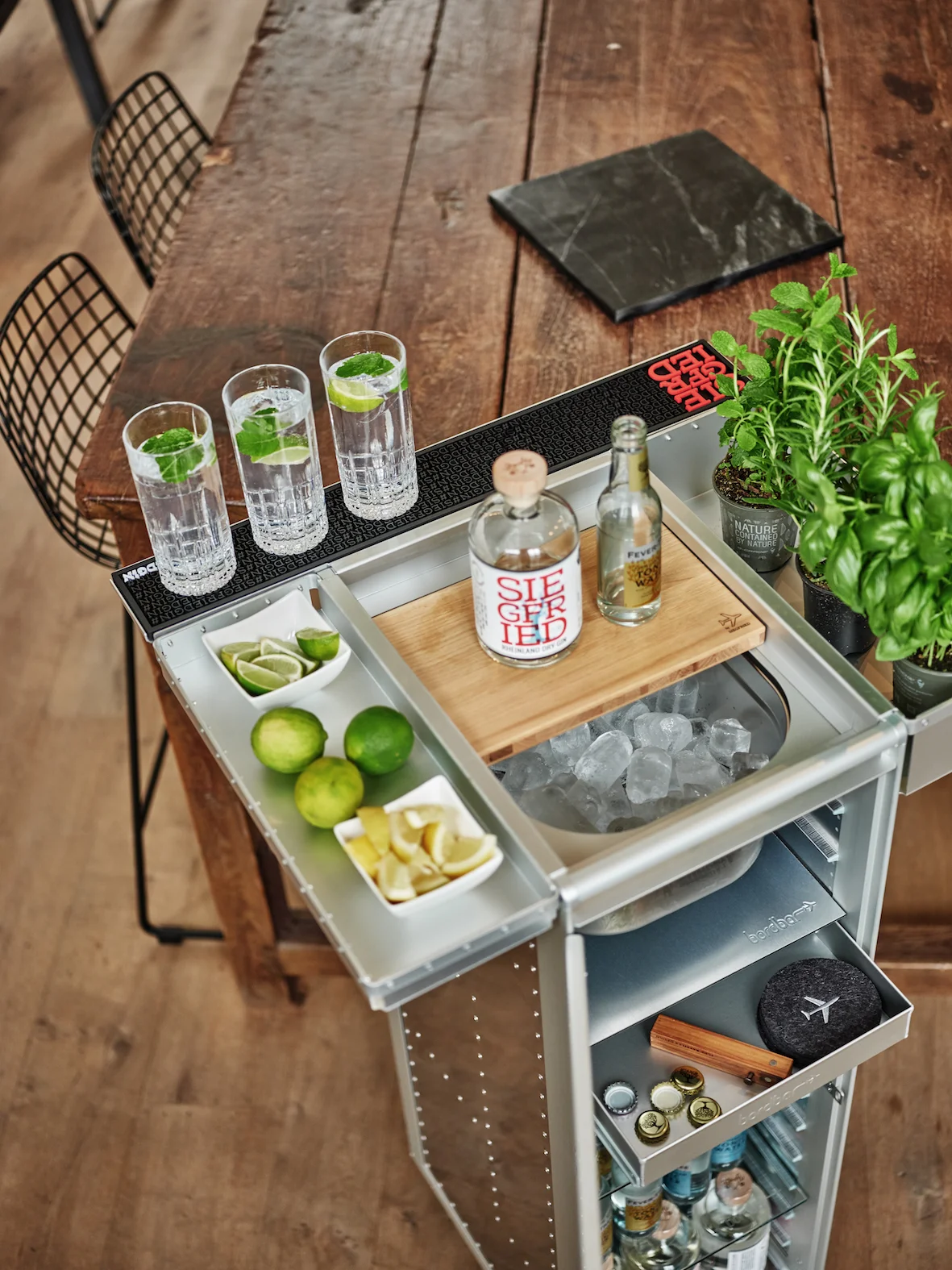 Der Rivet Rocker_by Siegfried wurde mit viel Liebe zum Detail entwickelt. Dies spiegelt sich auch in der Verarbeitung der Siegfried bordbar wider. Die Materialien stammen aus der Luftfahrt und sind damit auch hinsichtlich hoher Standards erprobt. Handgesetzte Nieten verbinden das Aluminium und den Edelstahl. Cleveres Equipment, das aus Sicht der Rheinland Distillers für den Gin-Genuss nicht fehlen darf, runden das Modell funktional ab.